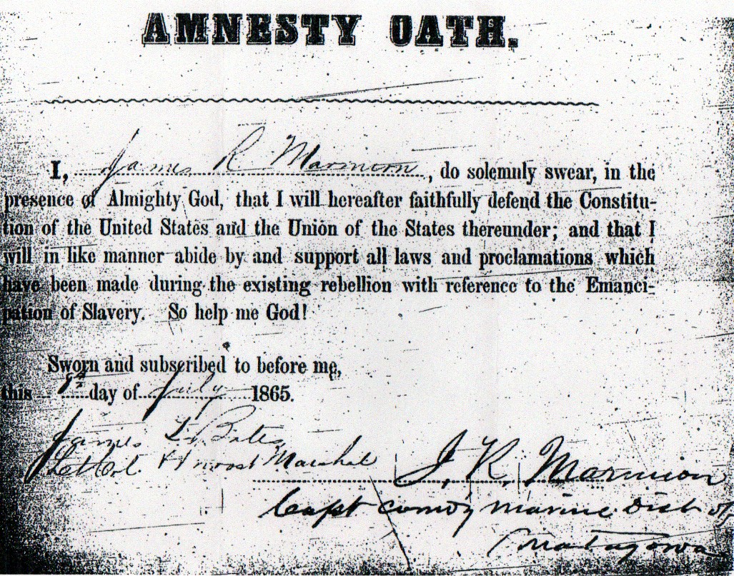 My interpretation of James R. Marmion's Parole of Honor certificate is that his duty station was at Matagorda , Texas where he commanded the Marine District of Matagorda, and that eventually the Federals got around to setting up a Provost Marshal office at Indianola , Texas . When that happened, then JRM reported into the Provost Marshal to be accounted for under the surrender agreement and to give his Parole of Honor. In return he was immediately released from his technical status of a surrendered prisoner of war which had existed since June 3rd. At the end of the Parole of Honor certificate is written the Federal government's promise that The above named officer will not be disturbed by the United States authorities, as long as he observes his parole, and the laws in force where he resides. Signing of the Parole of Honor was a requirement of the surrender agreement. Refusal to sign the parole would have resulted in his being imprisoned. This release on parole allowed him to be free and a resident of the United States . It did not, however, make him a citizen of the United States . President Andrew Johnson issued his first Amnesty Proclamation on May 29, 1865 granting full pardon to all who had taken part in the rebellion in exchange for their taking an Oath of Allegiance. Individuals who had been high ranking civil, military, and government officials of the Confederate States , and those with taxable property in excess of $20,000, had to apply personally to the President for their pardons. Taking the Oath of Allegiance under the provisions of this first Amnesty Proclamation has an entirely different meaning and intent from the giving and receiving of a final military parole. Taking the Oath of Allegiance was an act which restored one's citizenship (or, if you prefer, granted one citizenship in Mr. Lincoln's new and more perfect Union ). The military parole was a promise to refrain from further armed resistance against Federal authority in exchange for one's personal freedom to go where one pleased. Violation of this military parole could result in a former Confederate soldier being imprisoned. Otherwise, the ex-Confederate soldier could not be legally prosecuted or persecuted for his role in the war. The second document that you copied for my inspection is James R. Marmion's Amnesty Oath signed the next day, July 8, 1865, at Indianola , Texas before the same Federal Provost Marshal, Lieutenant Colonel James L. Bates. This act was an entirely voluntary act on the part of JRM but was necessary if he wanted to vote, buy or sell property, or any other of the legal things that required citizenship. This Amnesty Oath is a variation of the standard Oath of Allegiance requiring the signer to acknowledge the emancipation of the slaves. Hope this explains things! Hugh |