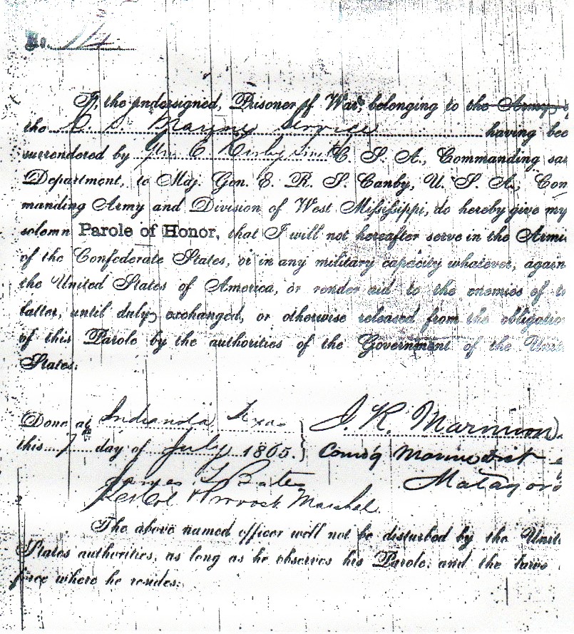 | This first document is James R. Marmion's parole certificate (not a letter) issued by Lieutenant Colonel James L. Bates, a Federal Provost Marshal, at Indianola , Texas on July 7, 1865. The Confederate Trans-Mississippi Department was officially surrendered on May 26, 1865 at New Orleans , Louisiana , but the surrender documents were not signed by Lieutenant General E. Kirby Smith until June 3, 1865 aboard a Federal warship sent to Galveston Harbor for that purpose. Smith was in Houston at the time his subordinates negotiated the surrender agreement with Federal authorities in New Orleans . All Confederates under Smith's T-M Department command then became technically prisoners of war. This does not mean that any of them were sent off to POW camps. Most of the soldiers in the T-M Department had already disbanded and gone home by mid-May 1865, so it became necessary to require them to report into a Federal parole center nearest their homes to be accounted for and then released upon their personal parole to go back home. The notice of this requirement was spread by printed circular, newspapers, and word of mouth. Others who had remained at their duty stations (usually the officers such as Captain James R. Marmion) waited until word of the surrender officially reached them, and were released on parole from their duty station as soon as Federal Provost Marshals could get to these stations.