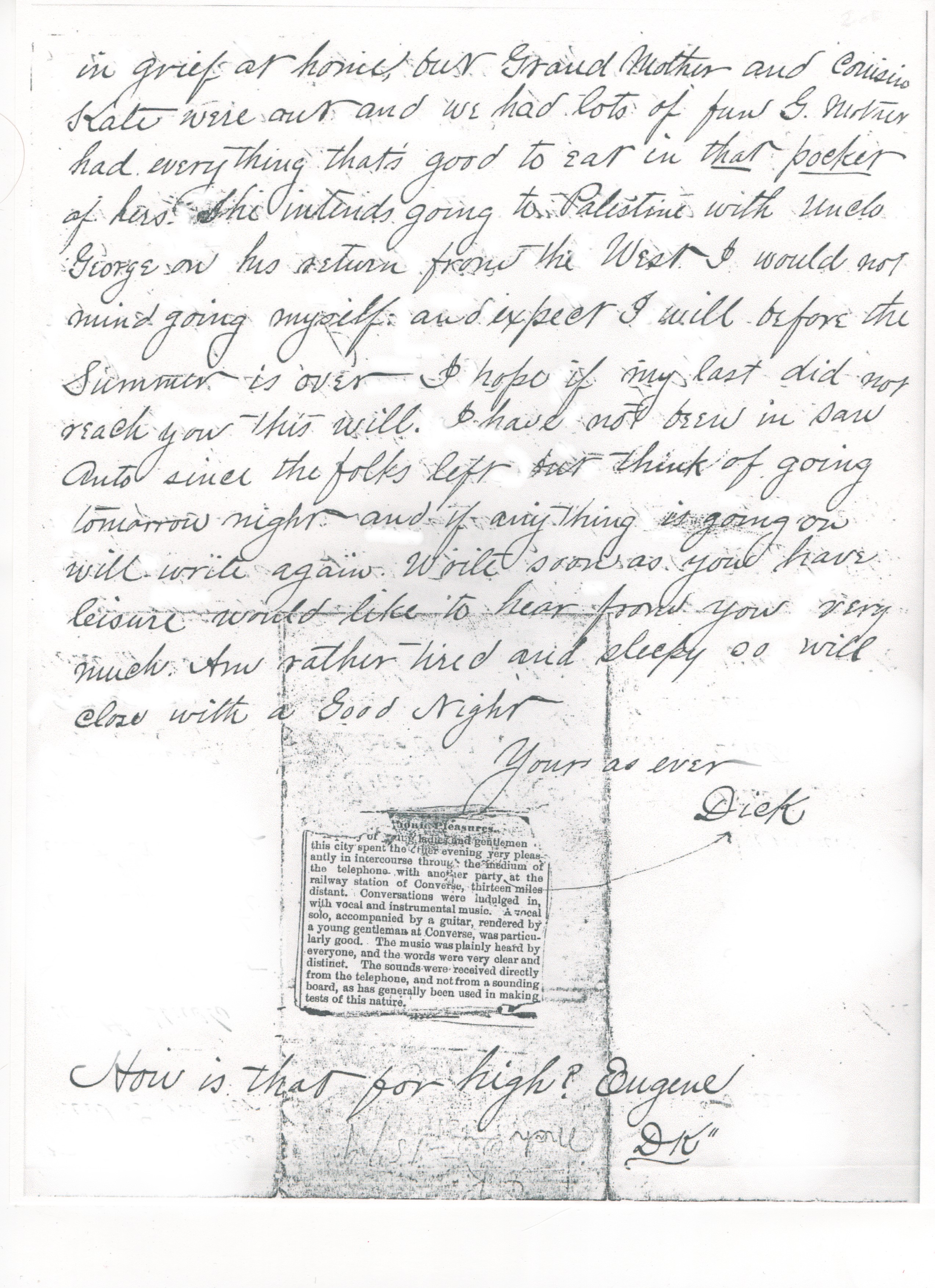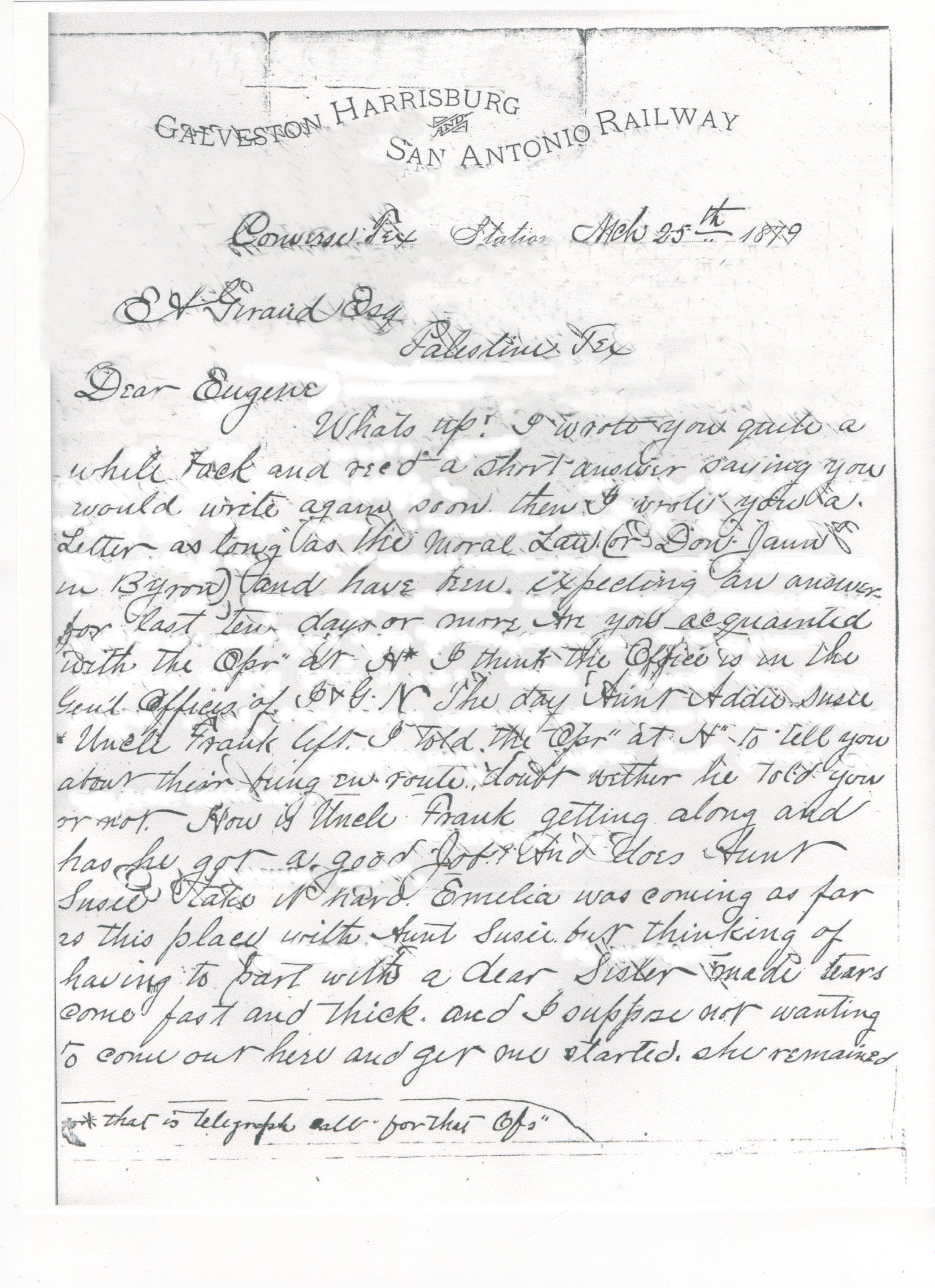 E A Giraud Esq. Palestine Tex Dear Eugene Whats up? I wrote you quite a while back and need a short answer saying you would write again soon. then I wrote you a Letter as long as the Moral Law (or Don Juan in Byron) and have been expecting an answer for the last ten days or more. Are you aquainted with the Opr or H* I think the office is in the Genl offices of G&G N. The day that Aunt Addie, Susie and Uncle Frank left I tild the Oper at H to tell you about them being en route. Doubt weather he told you or not. How is Uncle Frank getting along and has he got a good job? And soes Aunt Susie take it hard. Emilia was comming as far as this place wih Aunt Susie but thinking of having to part with a dear Sister made tears come fast and tick and I suppose not wanting to come out here and get one started, she remained in grief at home, but Grandmother and cousins Kate were out and we had lots of fun GMother had everything that's good to eat in that pocket of hers. She intends going to Palestine with Uncle George on his return from the West. I would not mind going myself and expect I will before the summer is over. I hope if my last did not reach you this will. I have not been in San Anto since the folks left, but think of going tomorrow night and if anything is going on will write again. Write soon as you have leisure would like to hear from you very much. Am rather tired and sleepy so will close with a good night Yours as ever Dick (clipping from newspaper) How is that for high? Eugene! "DK" |