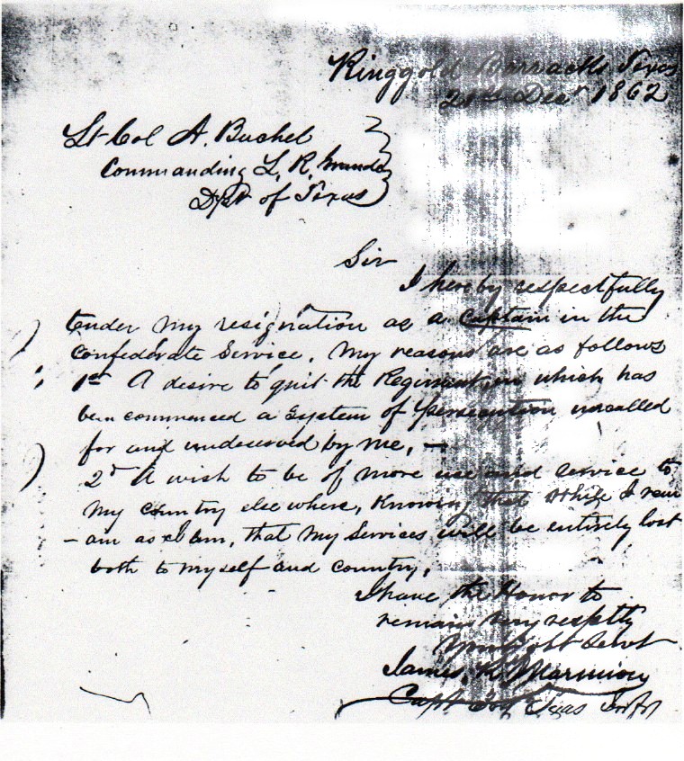 | Captain James Roger Marmion's Resignation. Riggold Barracks Texas Dec 1862 |