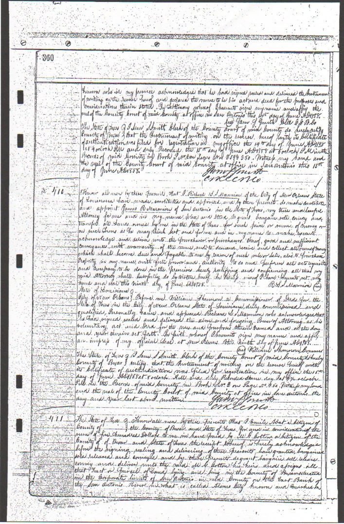 1858 No all men by these presents that I Richard L. S. Marmion of the city of new Orleans state of Louisiana have made constituted an appointed and find these presence do make constitute and appoint James R Marmion of San Antonio, my true and lawful Attorney, and in my name place and stead as grant, sell, bargain, convey and transfer own lands owned by me in the state of Texas for such price or some of money or for such sum as he may seem best, and for me and in my name to make knowledge execute and deliver undo the purchaser thereof , good and sufficient conveyance with warranty of the same, and to demand receive and collect, all sums of money which shall become due and payable to me by reason of such sale or sales, also to purchase property in my name with power and authority. To do and perform all acts requisite And necessary to be done in the ________ hereby ratifying and confirming all that my said attorney shall lawfully do by virtue hereof. In _____ whereof I have here unto set my hand and _______ this ninth day of June, A.D. 1858. R S L Marmion (signed) State of Louisiana State of Louisiana City of New Orleans} Before me, William Shannon, a commissioner of deeds for the State of Texas in the city of New Orleans, State of Louisiana duly commissioned and qualified. Personally came and appeared Richard L S Marmion who acknowledged that he had signed, sealed the above and foregoing Power of Attorney as his voluntary act said Deed for the needs and purpose therein named and on the day and year therein set forth. In faith whereof hereunto sign my name and apply an imprint of my official seal at New Orleans the ninth day of June A.D. 1858. (signed) William Shannon Conner State of Texas} County of Bexar} I Sam Smith, clerk of the county court of said county do hereby certify that the document of writing on the reverse therein with its certificate of authentication was filed for registration in my office the 15th day of June A.D. 1885 at 8 o’clock. All and duly recorded same day at 4 ½ o’clock file in the records of said county in Bk P2 on Page No. 360. Initials my hand and seal of the County Court of said County at office at San Antonio, the day and year last above written. Page 360 of book |