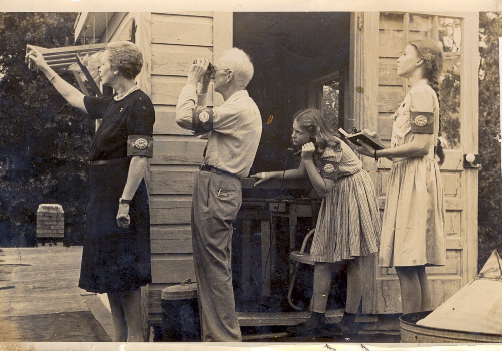 | WWII Plane Spotting on the roof of the Liversedge Home in Pass Christian in the center with the binoculars is John Liversedge and girl on the phone is Martha |