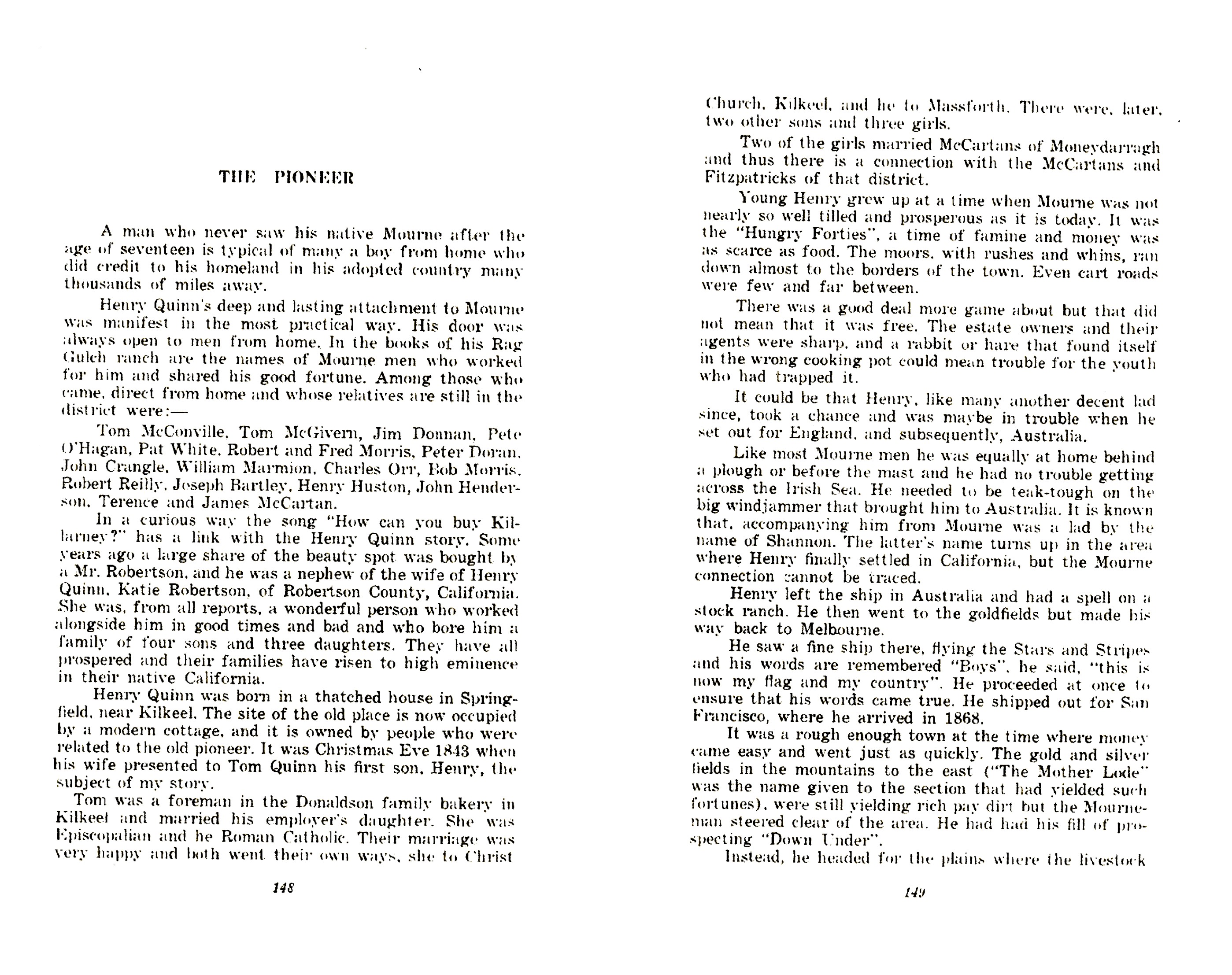 | Recent new information may prove that Daniel and William Marmion who are cousins are also related to Henry Quin via Alice Marmion (cousin of William and Daniel)and Patrick Makin through thier daughter Ann who married a Quinn .Dr Patrick Makin went to medical school in Scotland with Henry Marmion, another of thier cousins. In Mourne it is all a tangled web of relations. |