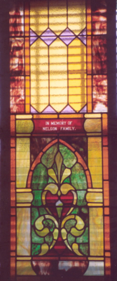 It was donated by Capt. John Nelson and Jane Marmion Nelson and was in the original St. Paul Church in Pass Christian, Mississippi built in 1874. This Church was destroyed by Hurricane Camille on Aug 17, 1969. The window was to be reused in the Damascus House this year. This house was finished just two weeks before Hurricane Katrina hit the Gulf Coast. It was decided the building would make a fine repository for tattered artifacts recovered after Camille. There was also in St Pauls an identical window that said Marmion. which looked just like the Nelson window This was destroyed by Camille. |
