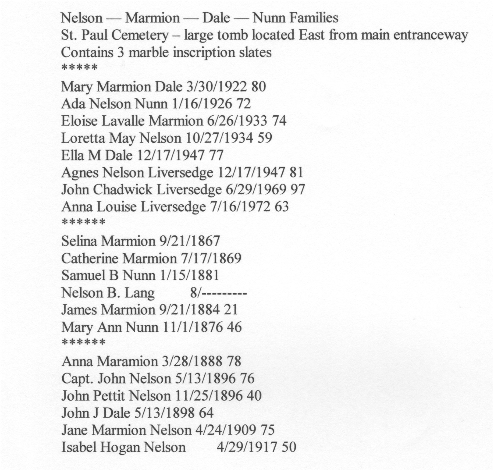 | we still are not sure if the Tomb contains the remains of Arthur Marmion, as well as Lawrence and Richard L.S. as well as Maria Swanson Marmion and her children. It looks as if the Tomb is missing either one or two plates. Perhaps it is the family members we are missing that that were inscribed on the plates. Barry is on the case however, with all of his resources, he sould have an answer in a few months. We keep our fingers crossed. |