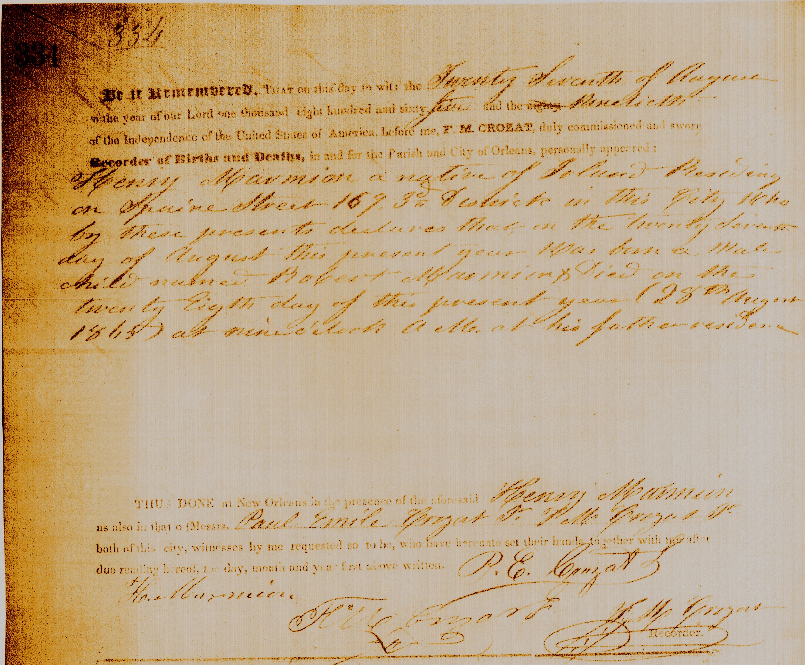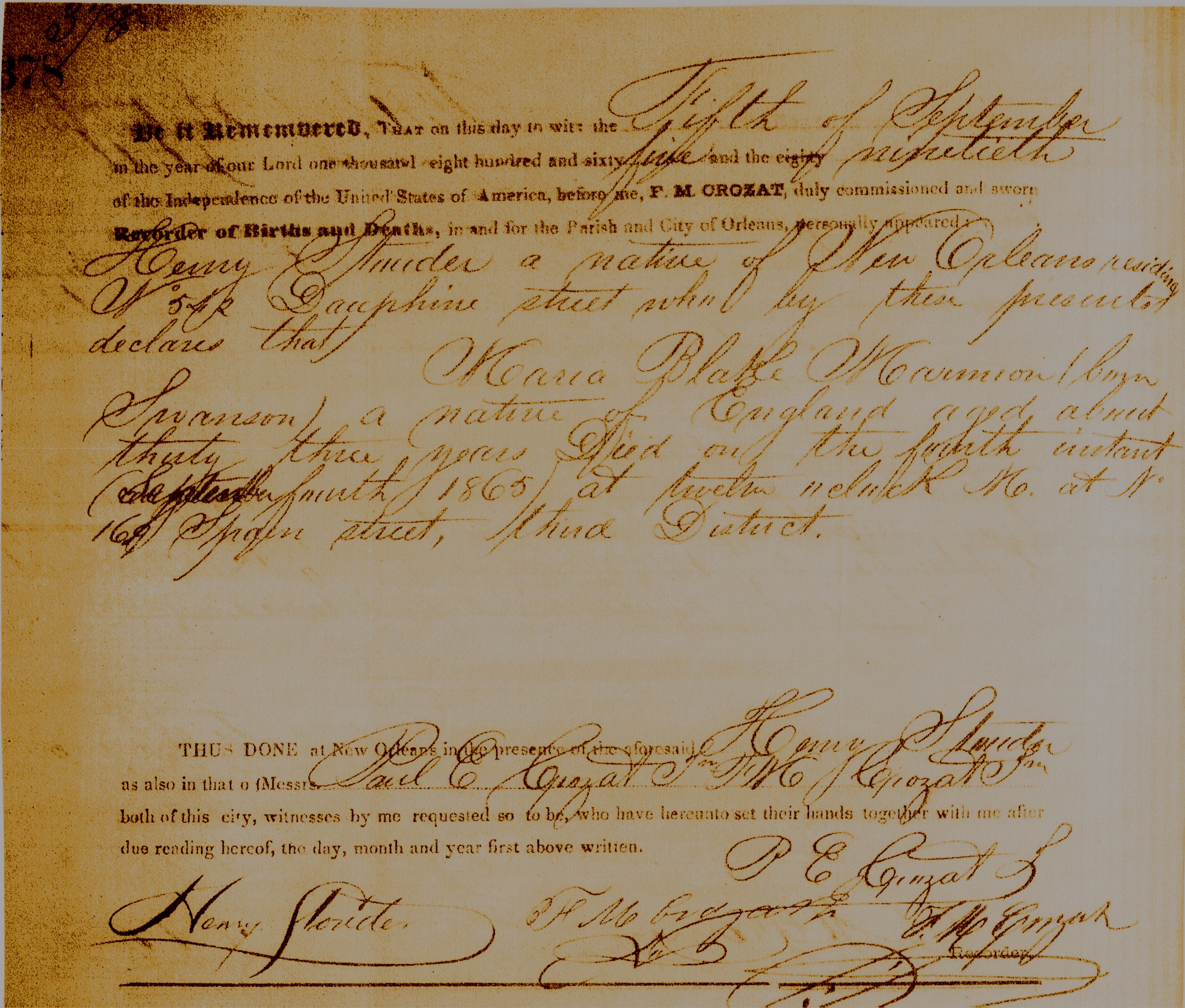 Maria Blake Sawnson Marmion's death certificate. She died a week after she gave birth to Robert. 1865